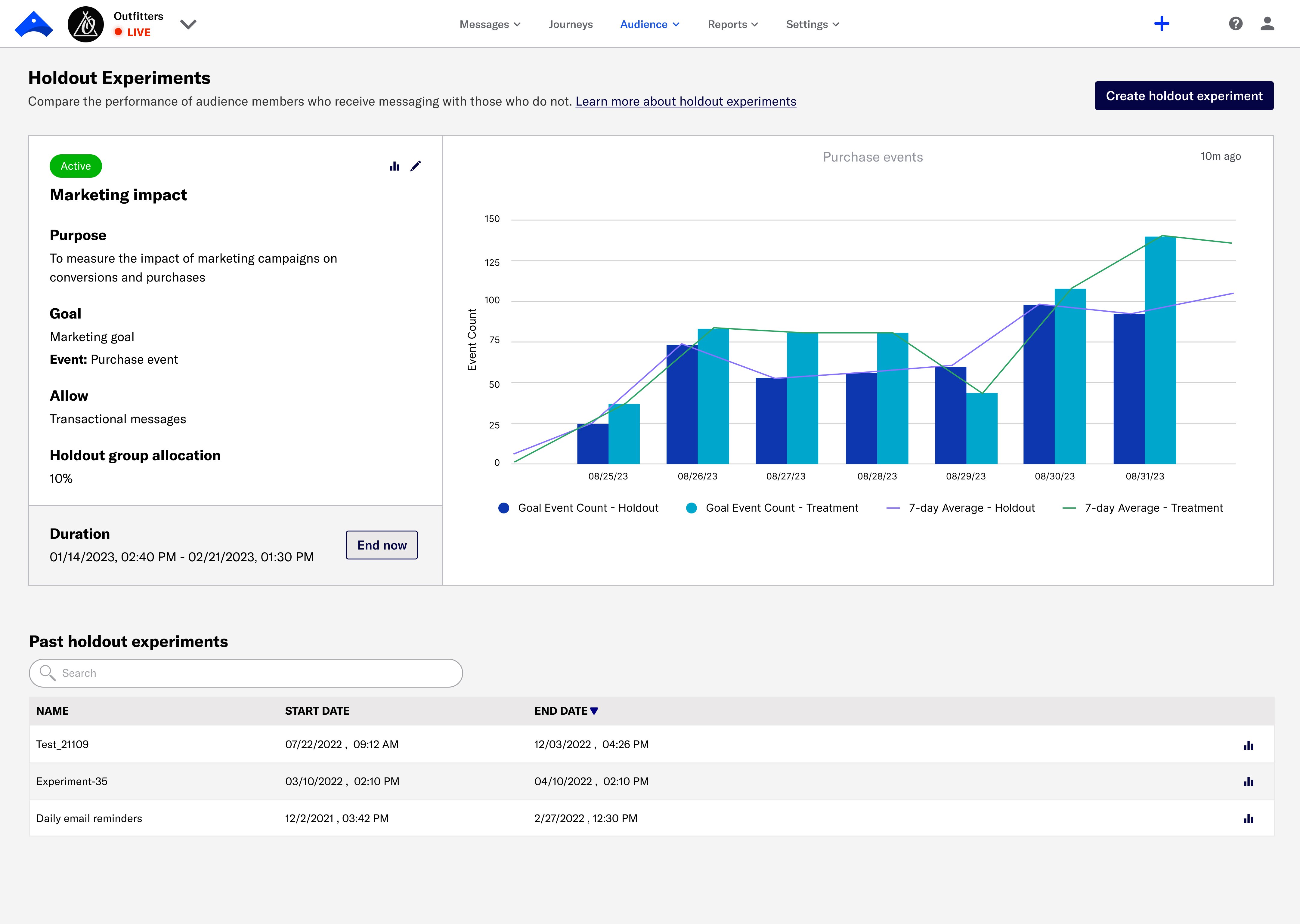 An experiment’s holdout group is the percentage of your total audience that is excluded from messaging. The remaining audience is the treatment group.