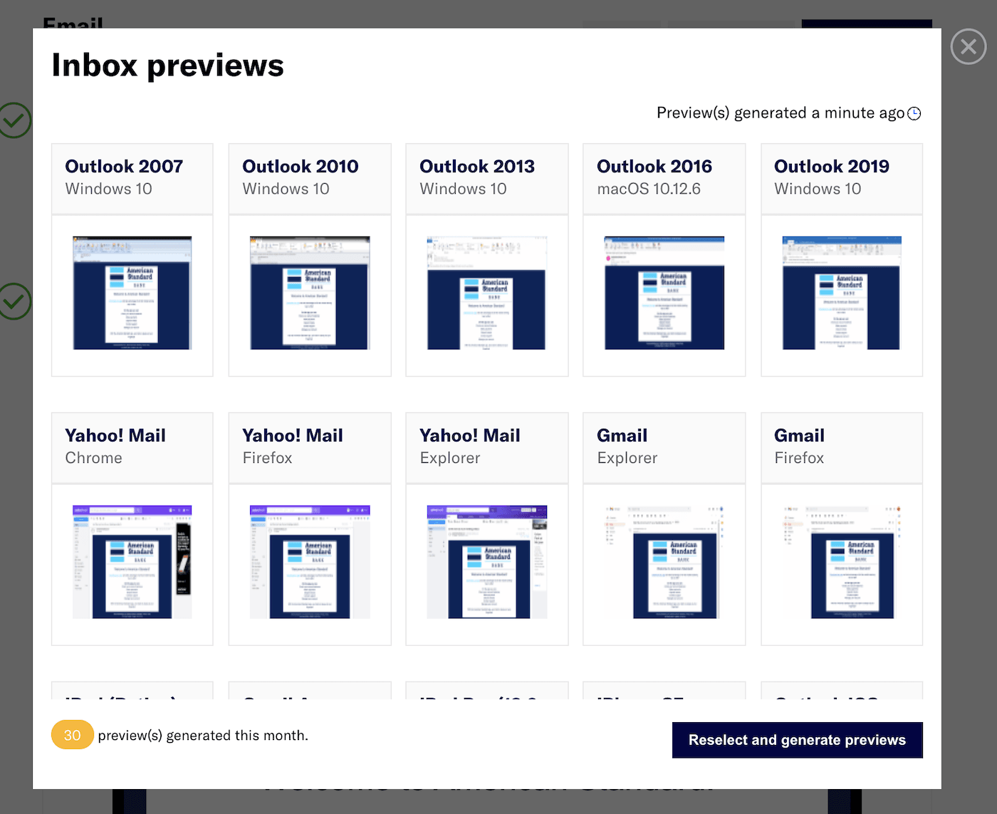 Before sending your message, you can preview what it will look like in various email clients. After adding the HTML body in a message or template, you can select Inbox preview and choose from a list of browser, desktop, and mobile clients. 90+ different client and device combinations are supported.