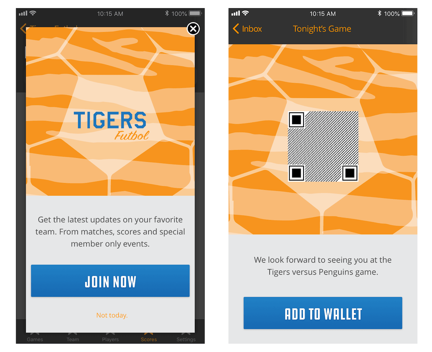 Landing pages appear as an overlay, with an X icon () to close/delete. They open when a user taps a push notification or in-app message. Landing pages are not PersistentMessage content that remains available even if the alerts for the message are dismissed. For example, Message Center, email, and SMS content can be viewed in the app’s Message Center, email inbox, or the device’s native SMS client until the message is deleted by its recipient. Non-persistent message types become unavailable when users dismiss them. A message’s linked content, e.g., a web link, deep link, an Apple News story, remains available as determined by the source host..