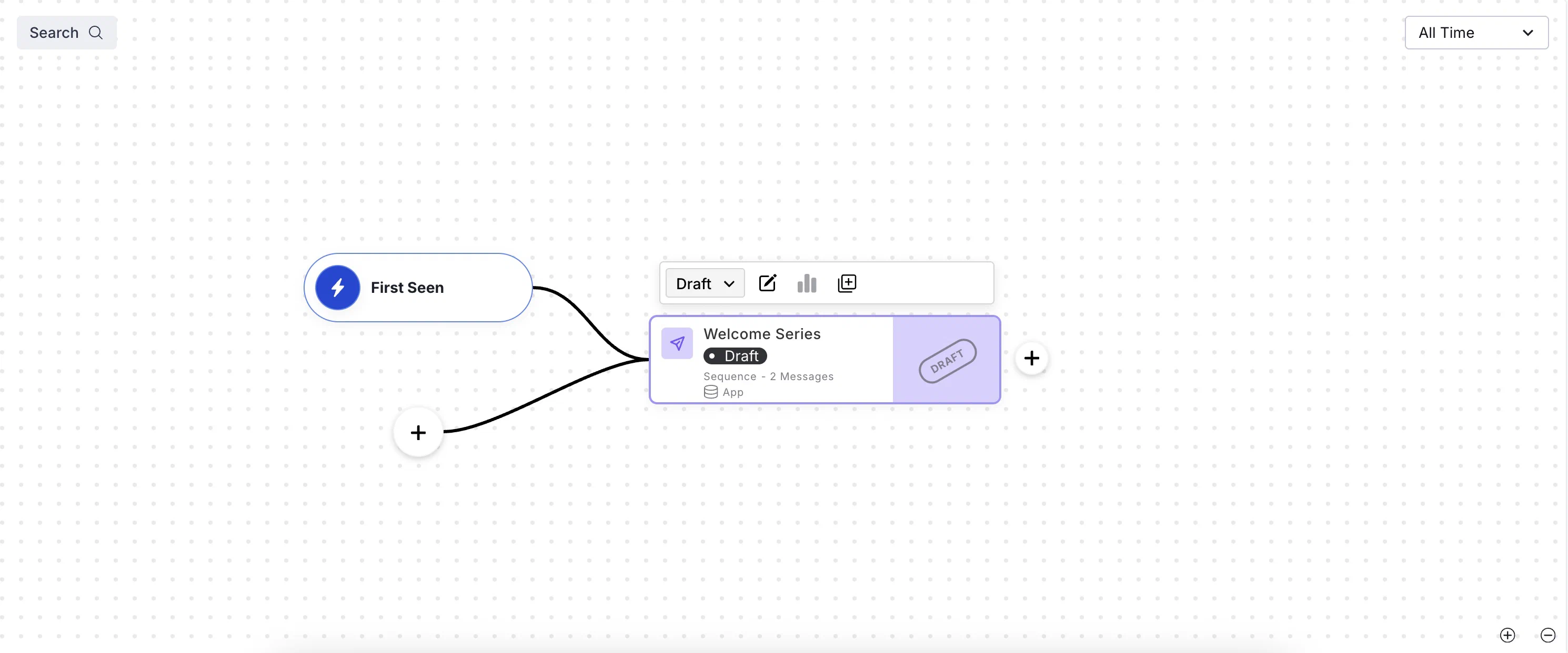 Quickly create draft Sequences, In-App Automations, and Scenes in the Journey map by entering a message name or selecting a Sequence TemplateA prefilled Sequence you can use as a starting point for common messaging scenarios.. After creating the draft, the map opens with the new component selected.