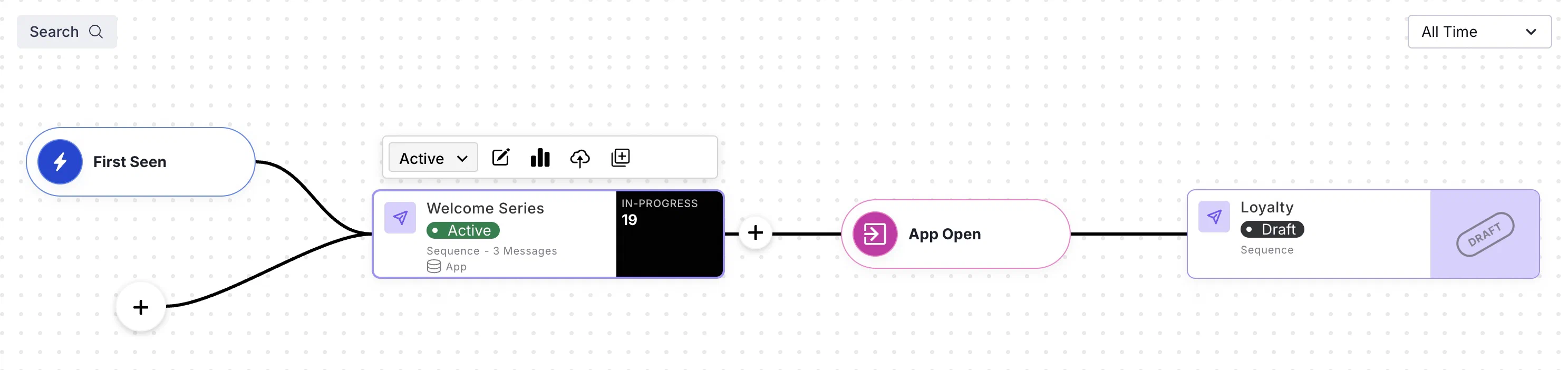 A Journey is a continuous user experience of connected Sequences, Scenes and/or In-App Automations. Design multi-step, cross-channel messaging workflows to onboard, retain, and re-engage users.