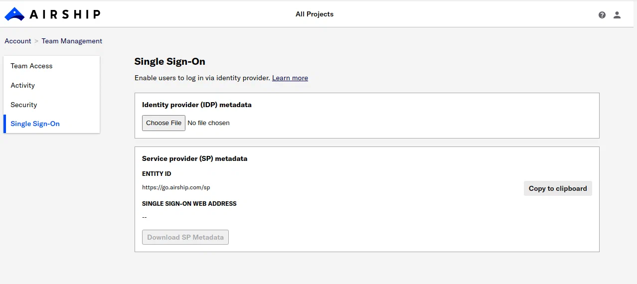 SSO is available for paid Airship pricing plans only. Please contact your account manager or Support to enable this feature if it is not already available for your account.