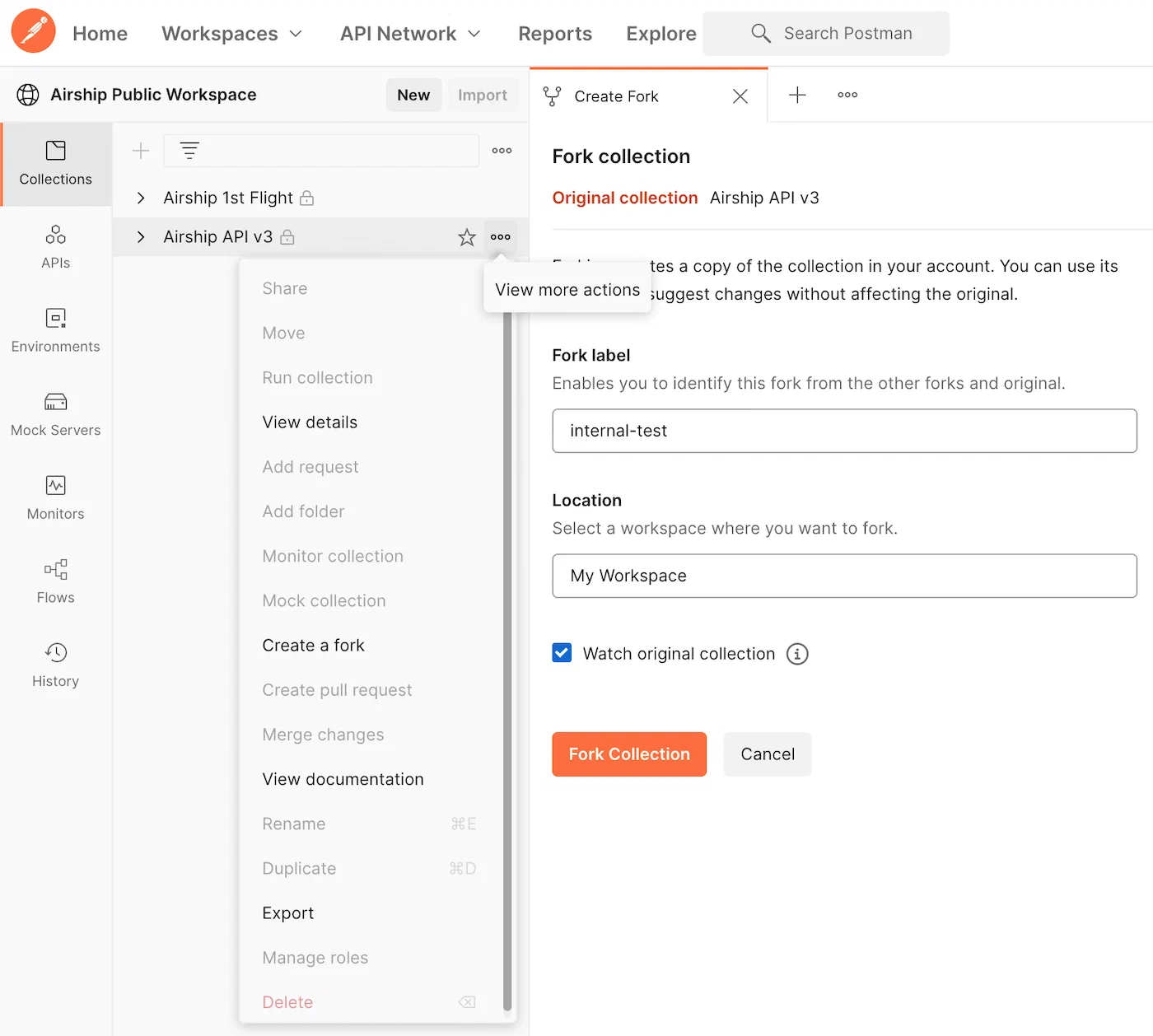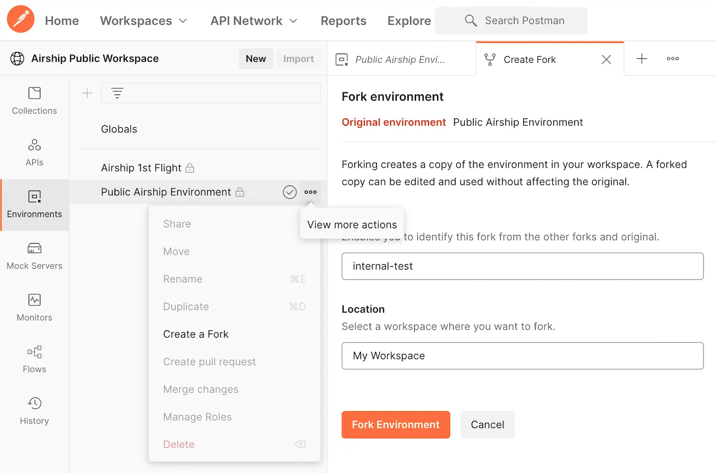 To use the Airship collection, you will fork the collection and an environment to your personal workspace, where you can personalize your payloads and add your project credentials, channels, etc. You can also choose to get updates when there are changes to the main collection.
