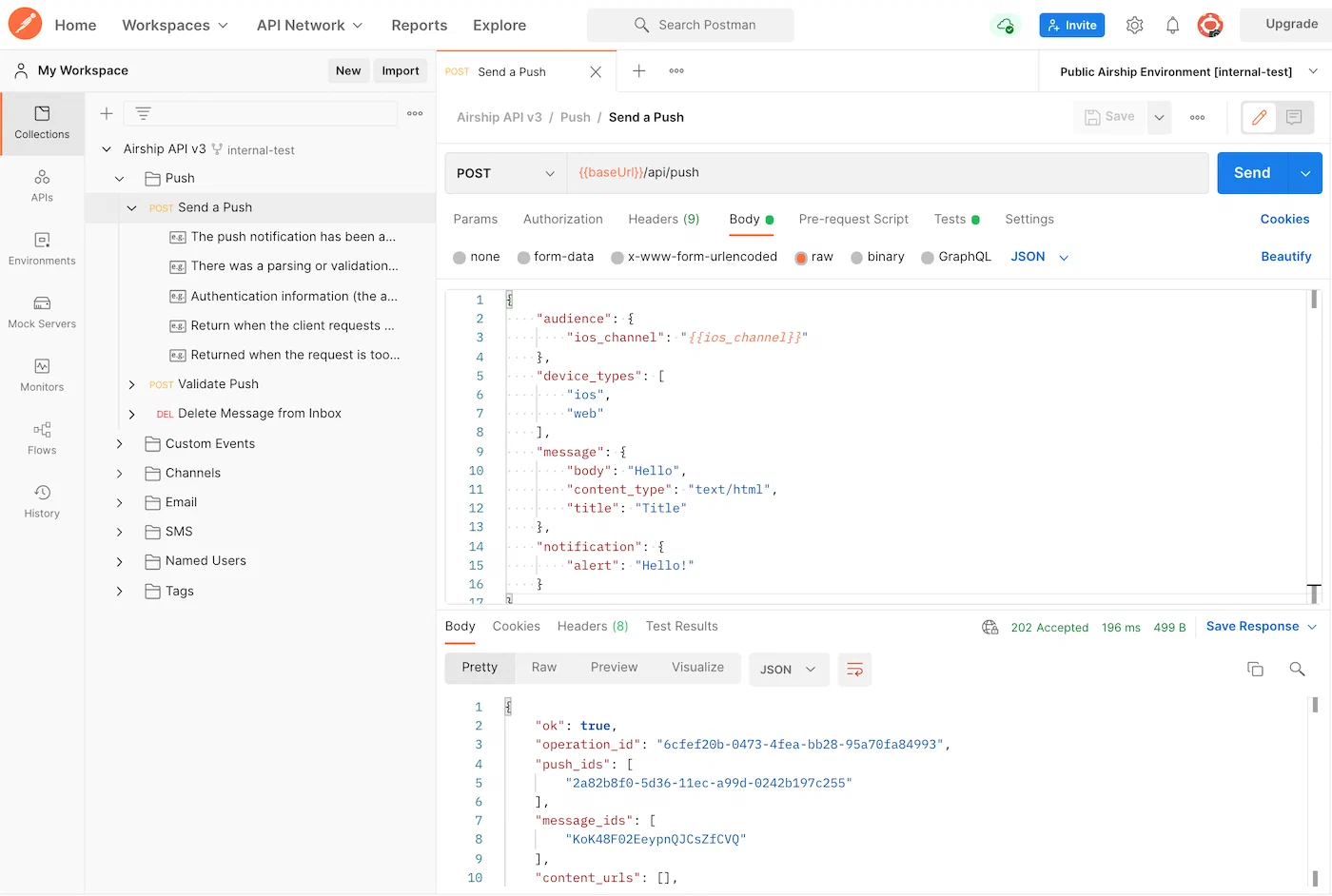 - In Airship API v3 select the Push folder, then open the request POST Send a Push.