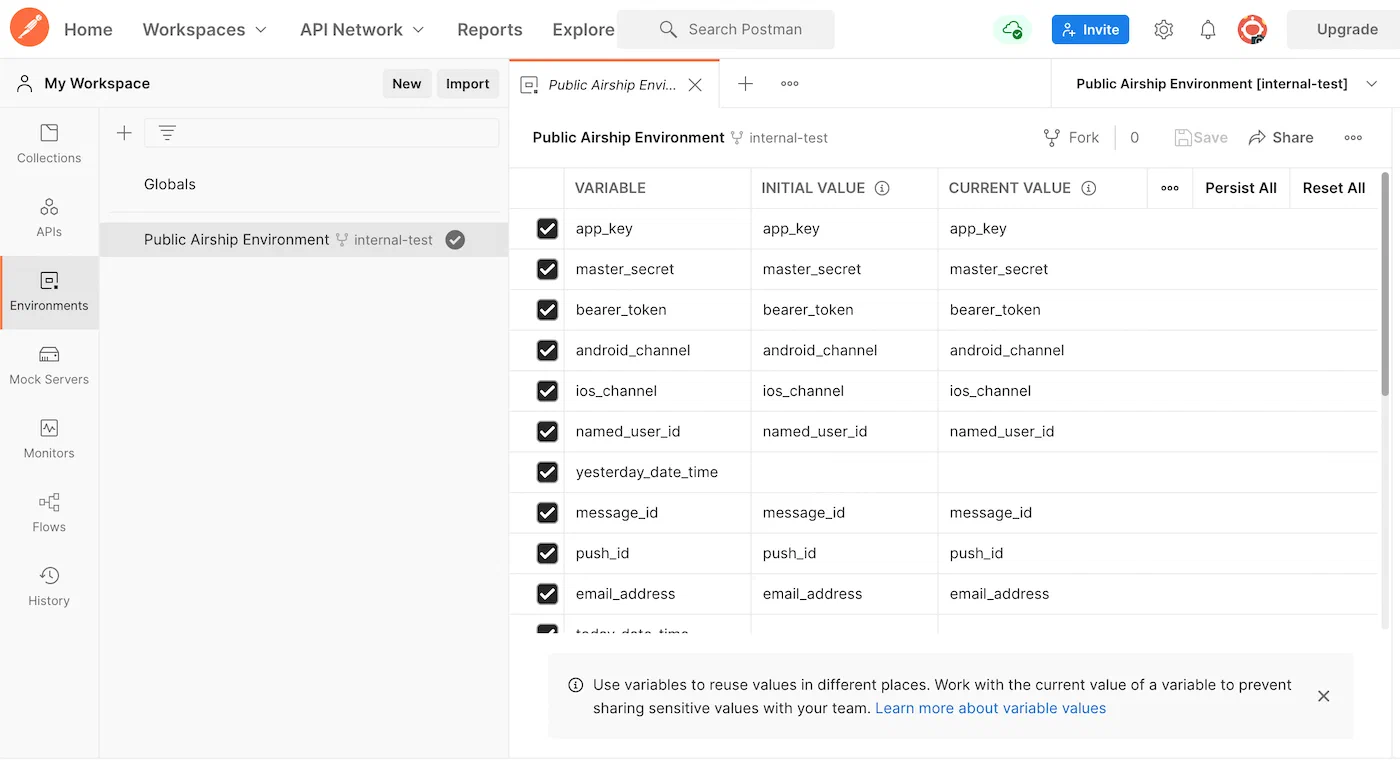 Follow the steps below to set up your variables in your Postman environment. All the variables defined in the Public Airship Environment are used in the Airship API v3 requests.