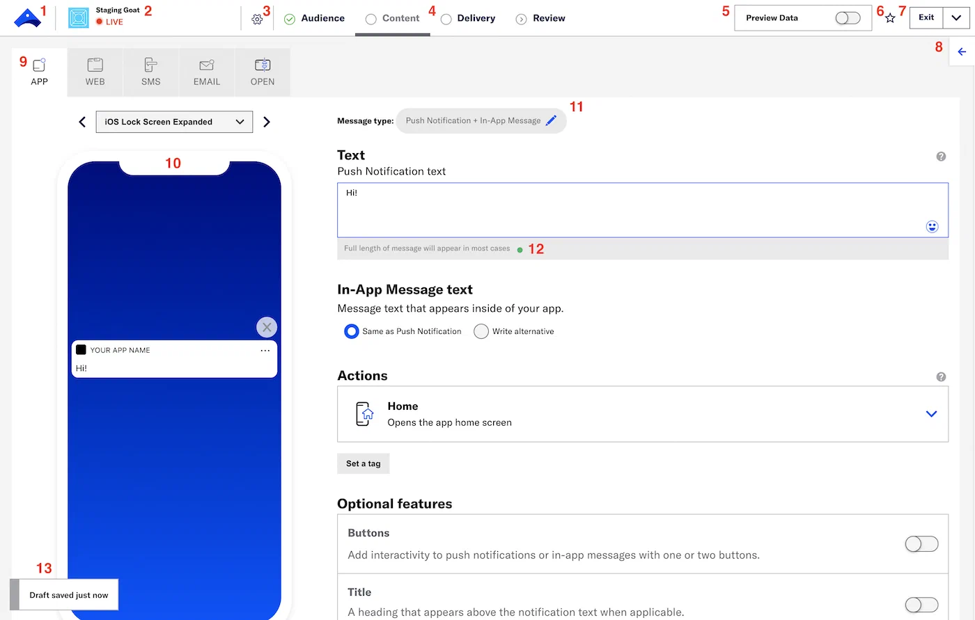 | 12 | For App and Web, a color-coded indicator appears below the text box, warning when your message may be truncated on some devices. For SMS, a counter appears above the text box, showing the total number of characters and how many individual SMS messages will be sent. Best practice is to make your message as brief as possible, though some customers find success when a message truncates, teasing their audience to learn more. |
