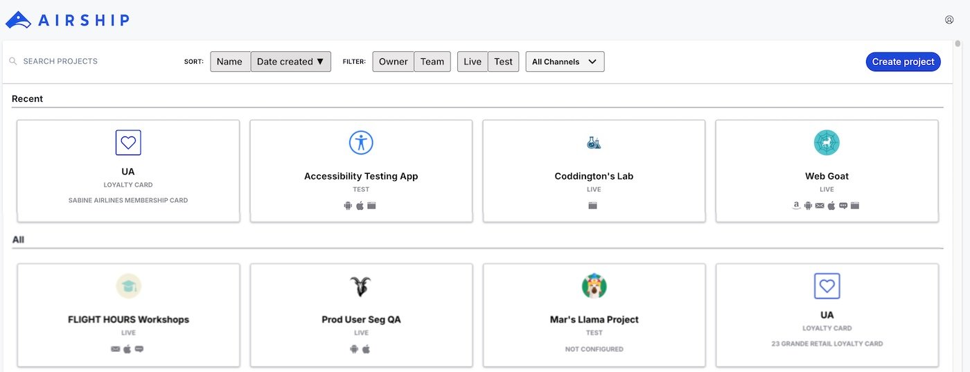 Almost everything you do with Airship happens inside a project, including creating messages and wallet pass templates.