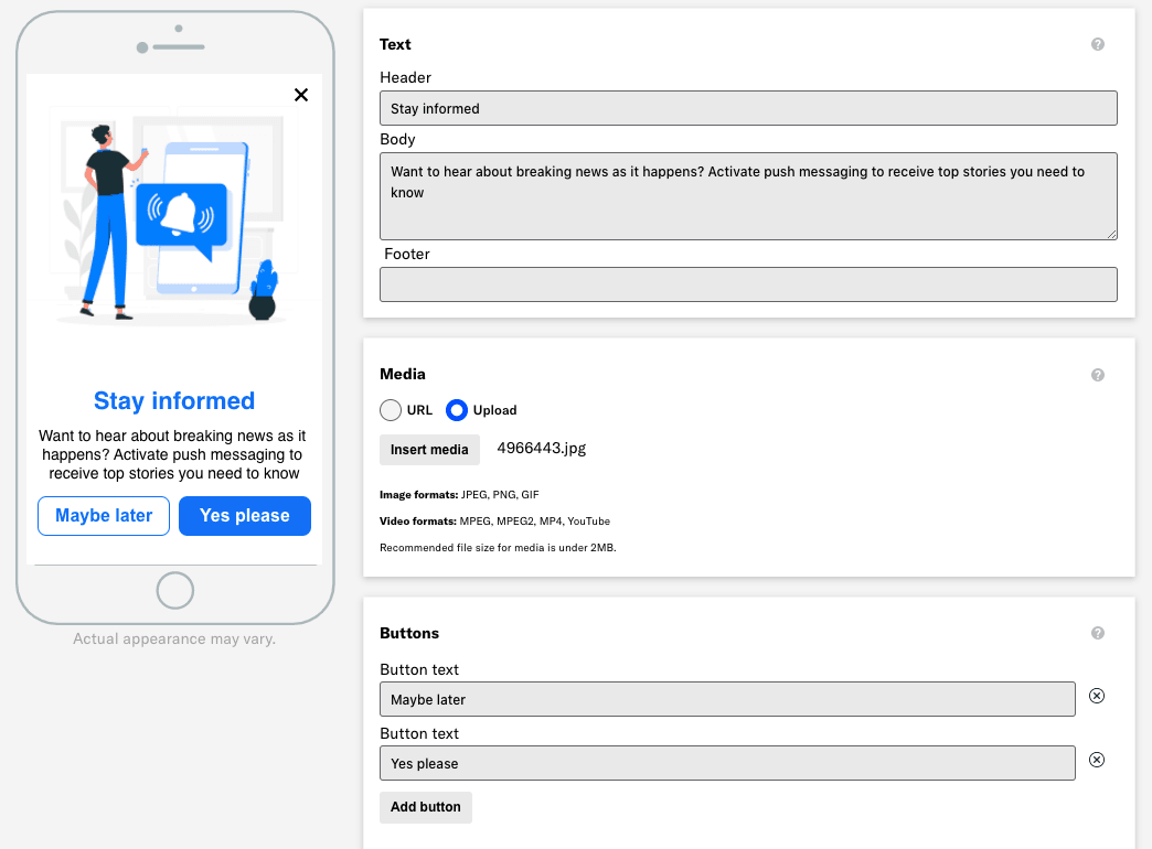 Now you have to set up the content of your in-app message. It should give the user context for what types of notifications they can expect, or what the benefit is to them for opting in (e.g., don’t miss updates about your favorite show, or important account transaction notifications, etc.).