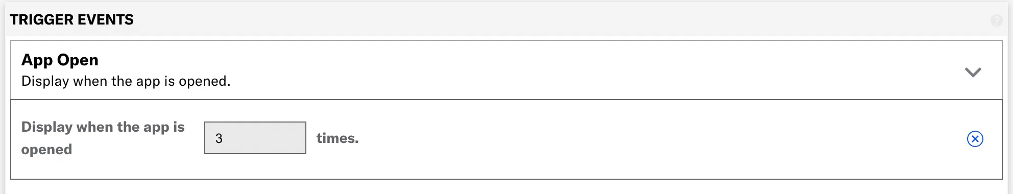 Finally, in the Behavior step, you need to decide what will trigger your in-app message. A simple and our-of-the-box way to do it is to display the message after the app is opened a certain number of times: select the App Open trigger and enter a number.