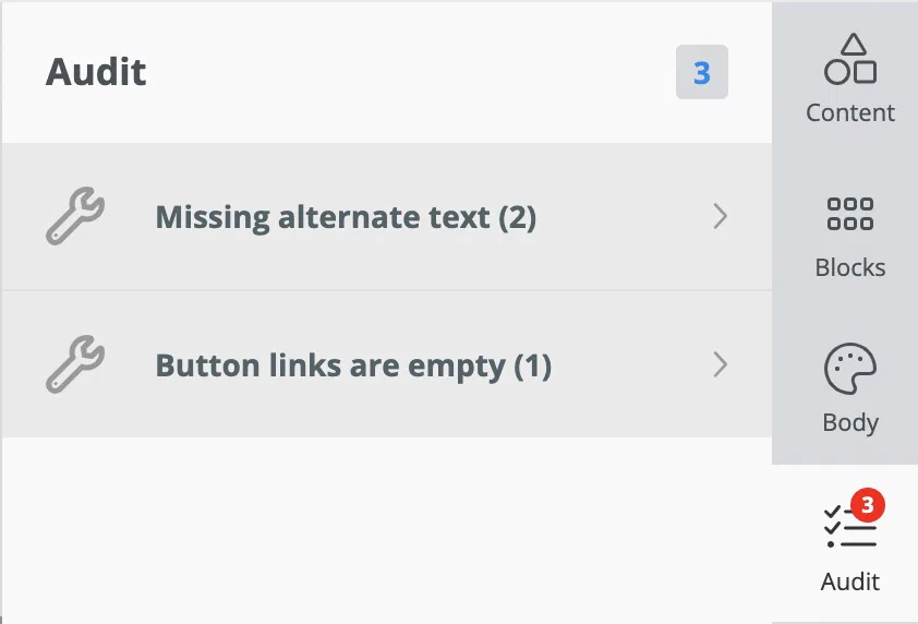 Select an issue type to go directly to where you can fix it. The audit is a warning only and does not prevent saving the design or sending the message.