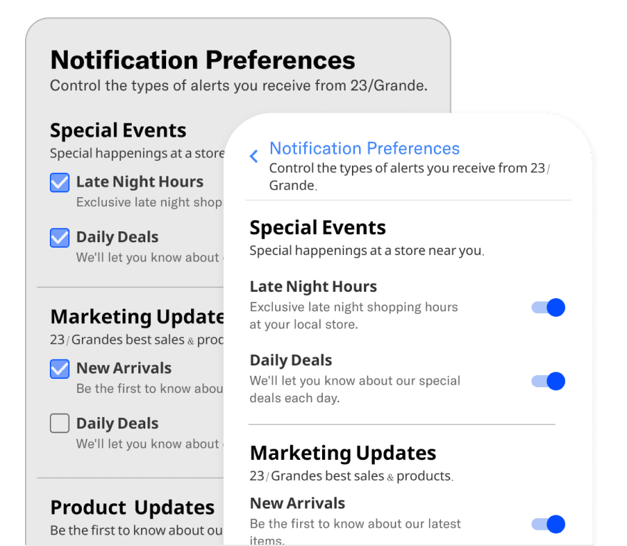 In an App Preference Center, you can add notification opt-in prompts for App, Web, Email, and SMS. They appear as embedded banners. For Email and SMS, users must add at least one email address or phone number, and users can manage addresses and numbers already opted in. All labels and fields within the prompts and modals are fully customizable.