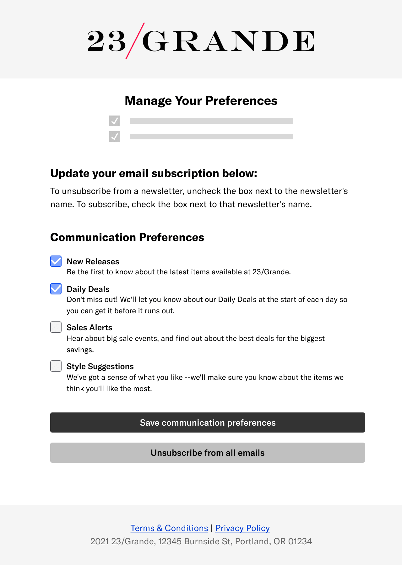 A Preference Center is a page where users can manage their opt-in statuses for the Subscription Lists in your project. Preference Centers are presented within your app or website or as an Airship-hosted web page.