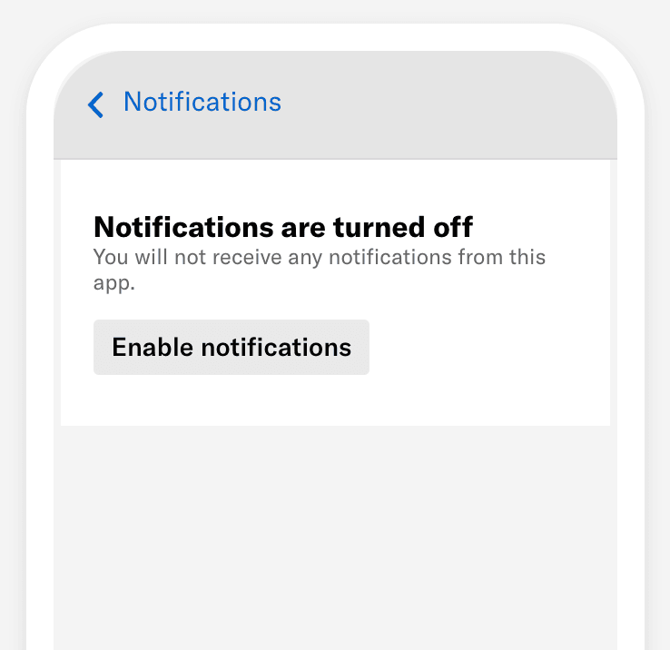 For App and Web, the prompt banner appears in the Preference Center on devices that have notifications disabled. You configure a single prompt for both App and Web that contains a button for opting in. Selecting the button opens the native notification settings for your app or a browser message asking the user to allow web notifications. For a web Preference Center, your web developer must code an action for the button.