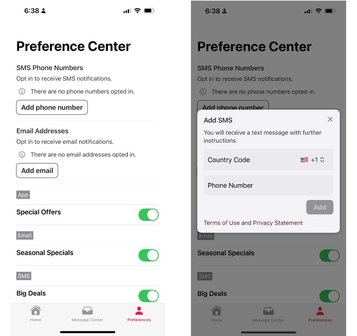 When creating an App Preference Center, you can add a section that prompts the user to opt-in to messaging and where they can manage their email addresses and phone numbers.