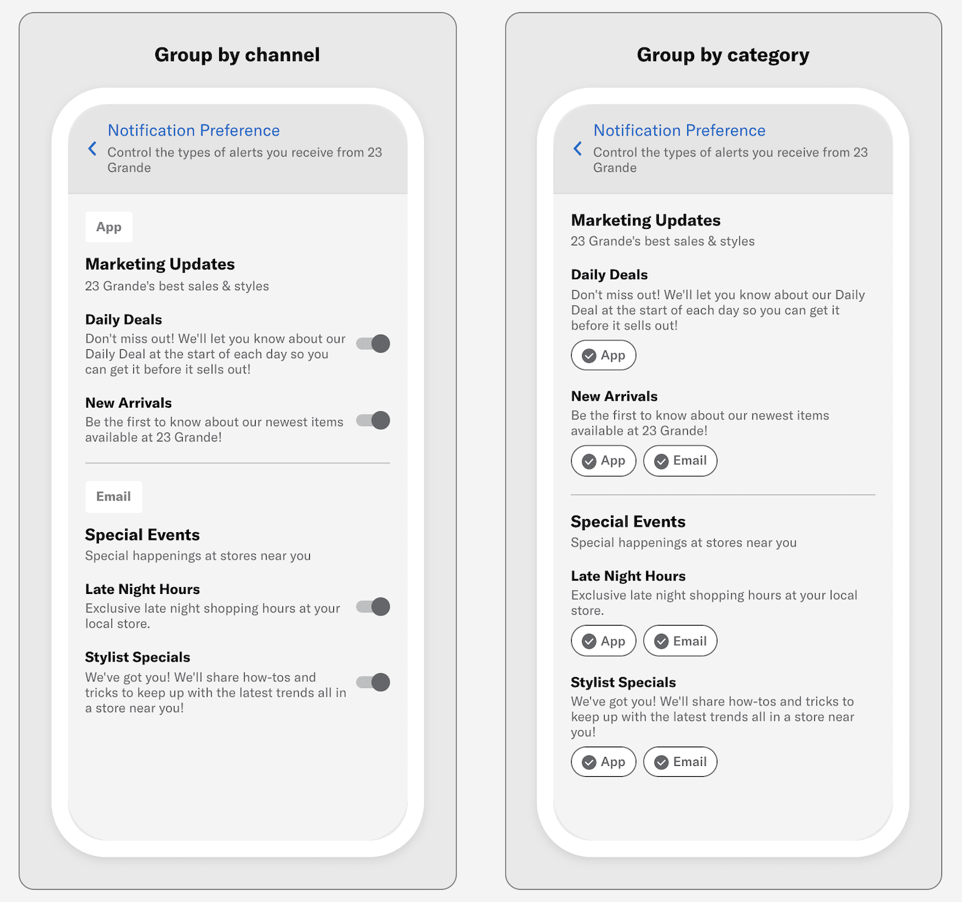 | Single-channel | App, web, email | Preferences are updated per channel. | Non-AXP |