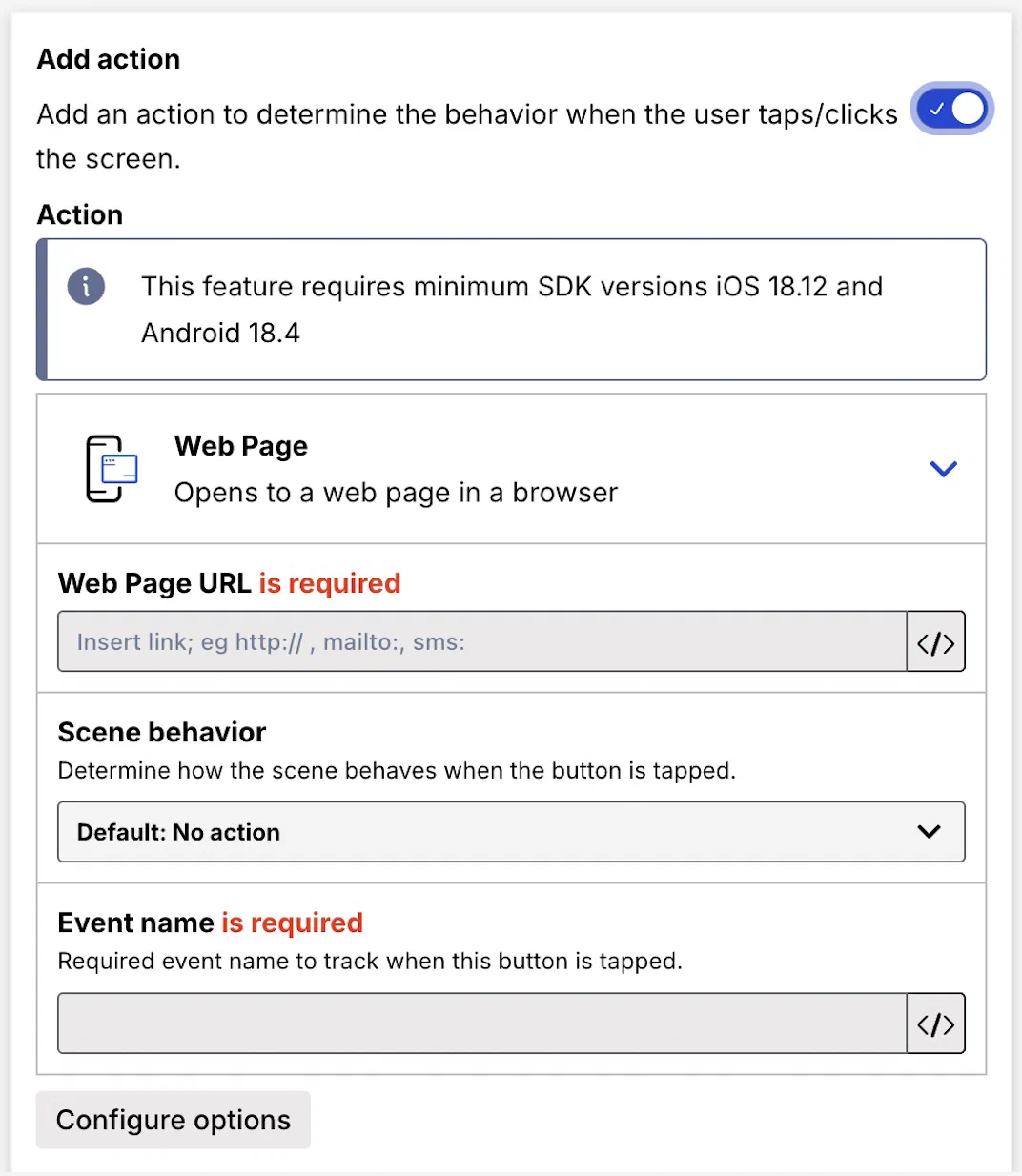 | Action: Scene behavior | Optional if an action is set. Determines how the Scene behaves when a user taps the link: No action, Next screen, Previous screen, Dismiss (closes the Scene), or Dismiss and cancel Repeat (closes the Scene and overrides the Repeat setting). The Deep Link action has options Dismiss and Dismiss and cancel Repeat only, with default behavior Dismiss. For Web Page and Adaptive Link, all Scene behaviors are available, with default behavior No action. | Select a behavior. |