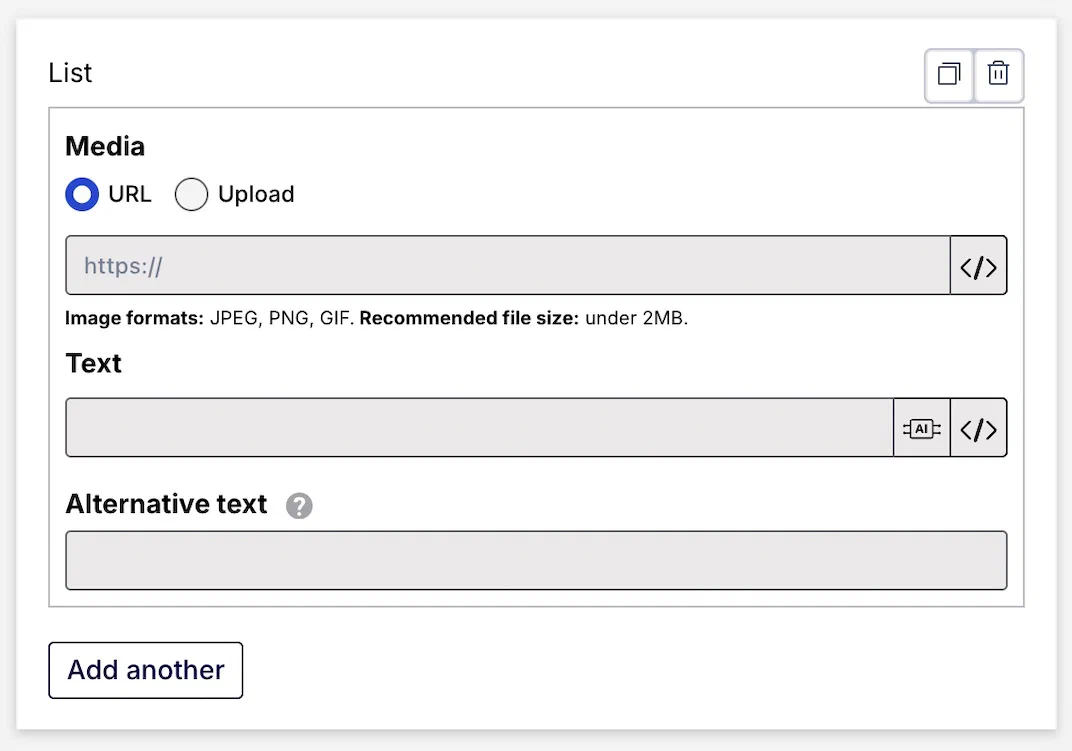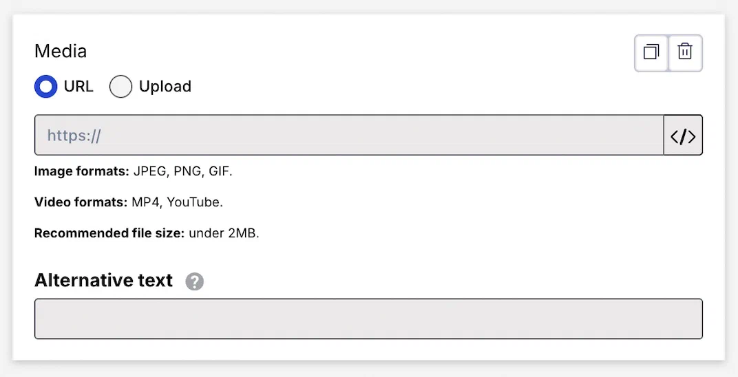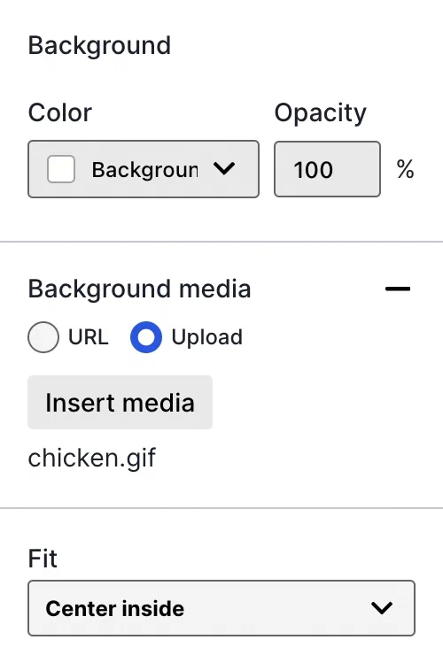 | Controls (For video Media only) | Enabling Show video controls displays player controls, information, and options at the bottom of a video: play/pause, time elapsed and total time, mute, fullscreen, download, playback speed, picture in picture, and a progress bar. Autoplay and Loop control playback. Enabling Muted loads the video in muted state. Show video controls and Muted are enabled by default. | Check the boxes to enable or disable each option. |