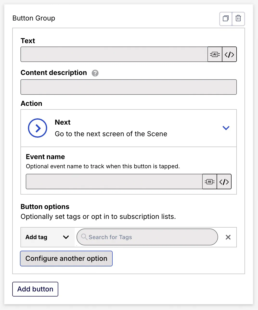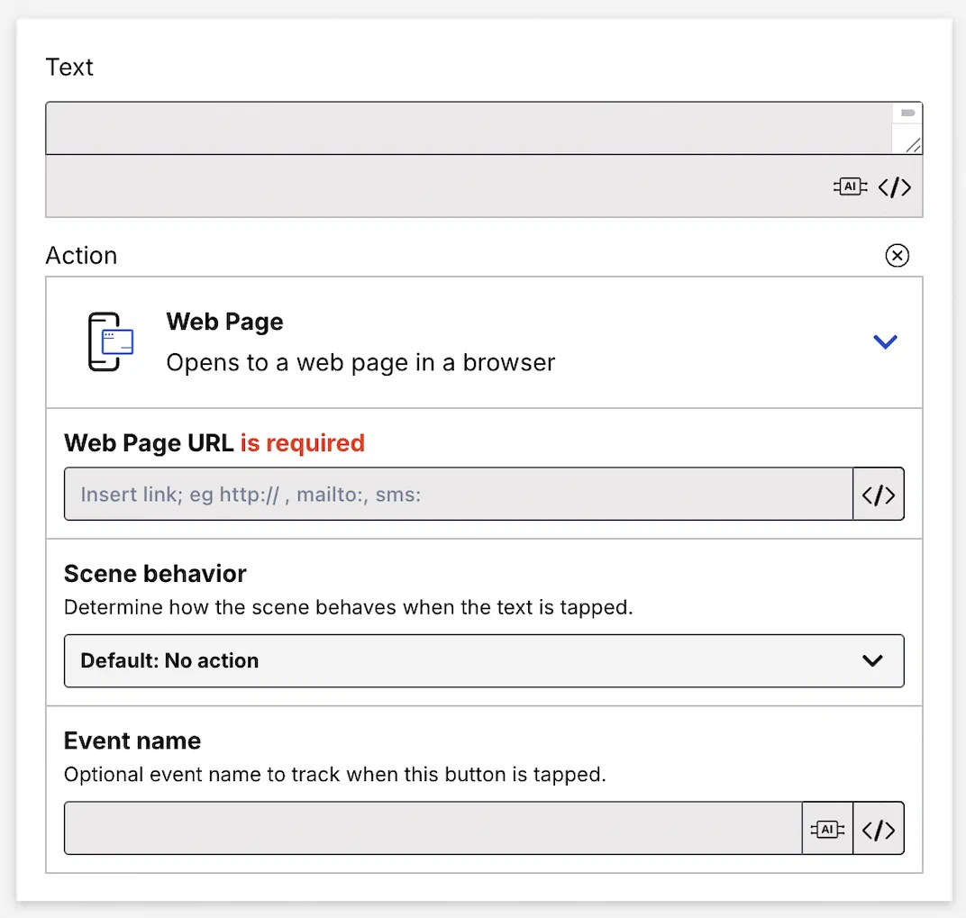 | Add action | Optional. Makes the text function as a link. The link can be a web URL, Adaptive LinkA vendor-agnostic, shortened mobile wallet pass link that supports templates for both Google Wallet and Apple Wallet. When a user taps the link, Airship determines the user’s platform and generates the right pass for that platform., or Deep Link. | Select Add action and configure an action and options. Follow the steps for Web Page, Adaptive Link, or Deep Link in Actions for in-app experiences. |