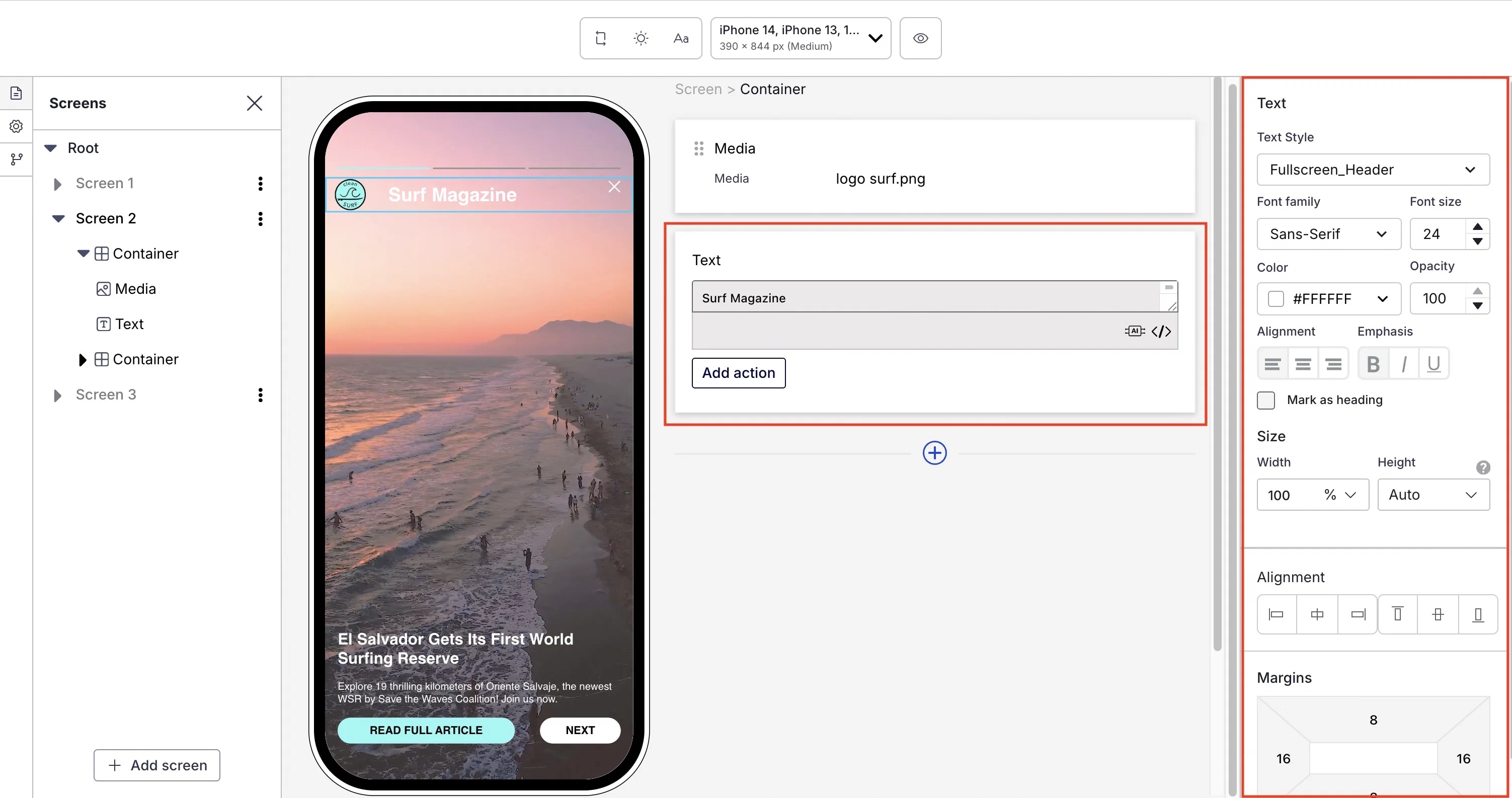 | Alignment (All content elements) | Determines the horizontal and vertical positions of content elements within a screen or Container: left, middle, or right, and top, middle, or bottom. See Alignment impact for more information. | Select an alignment. | |