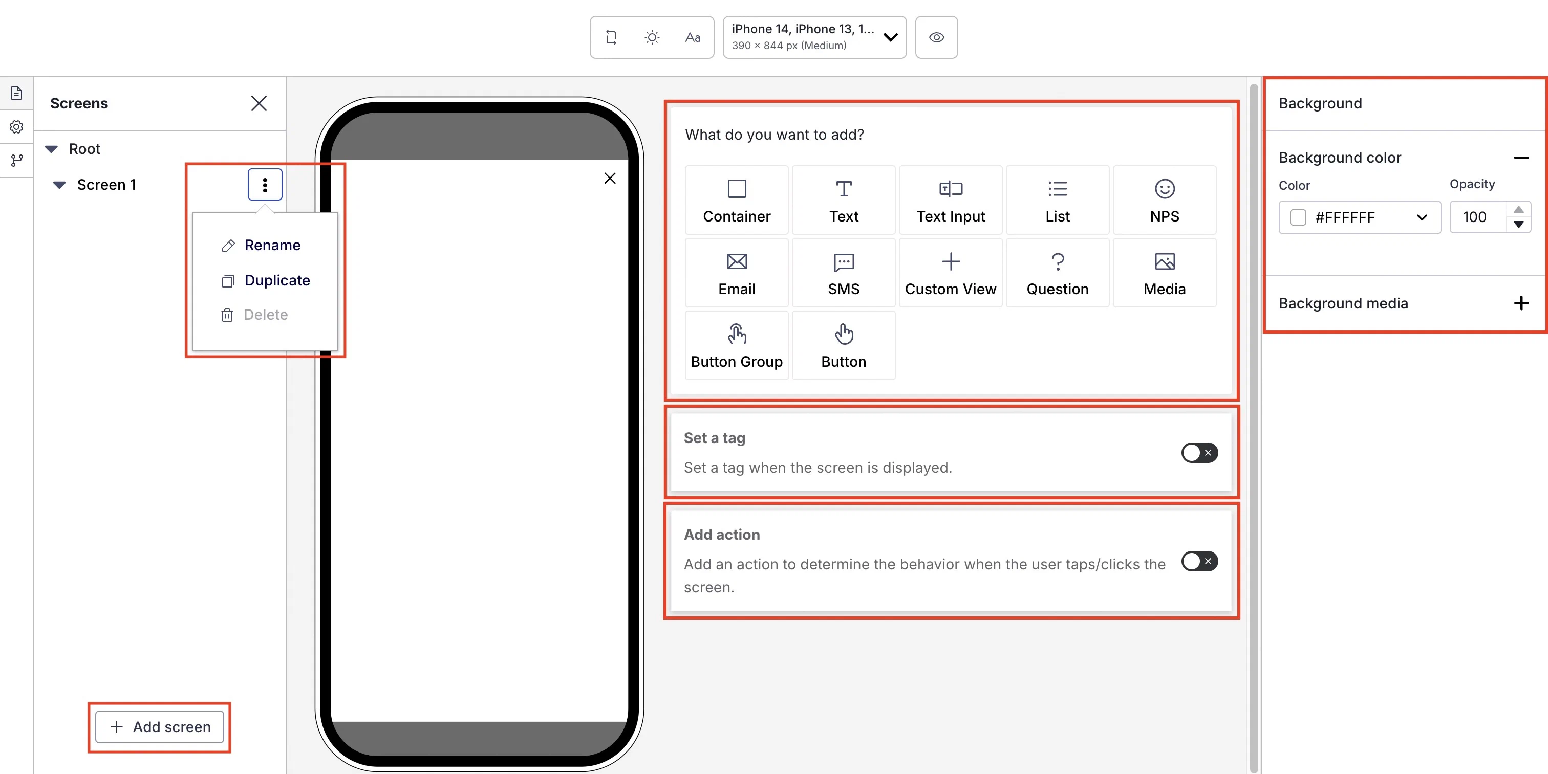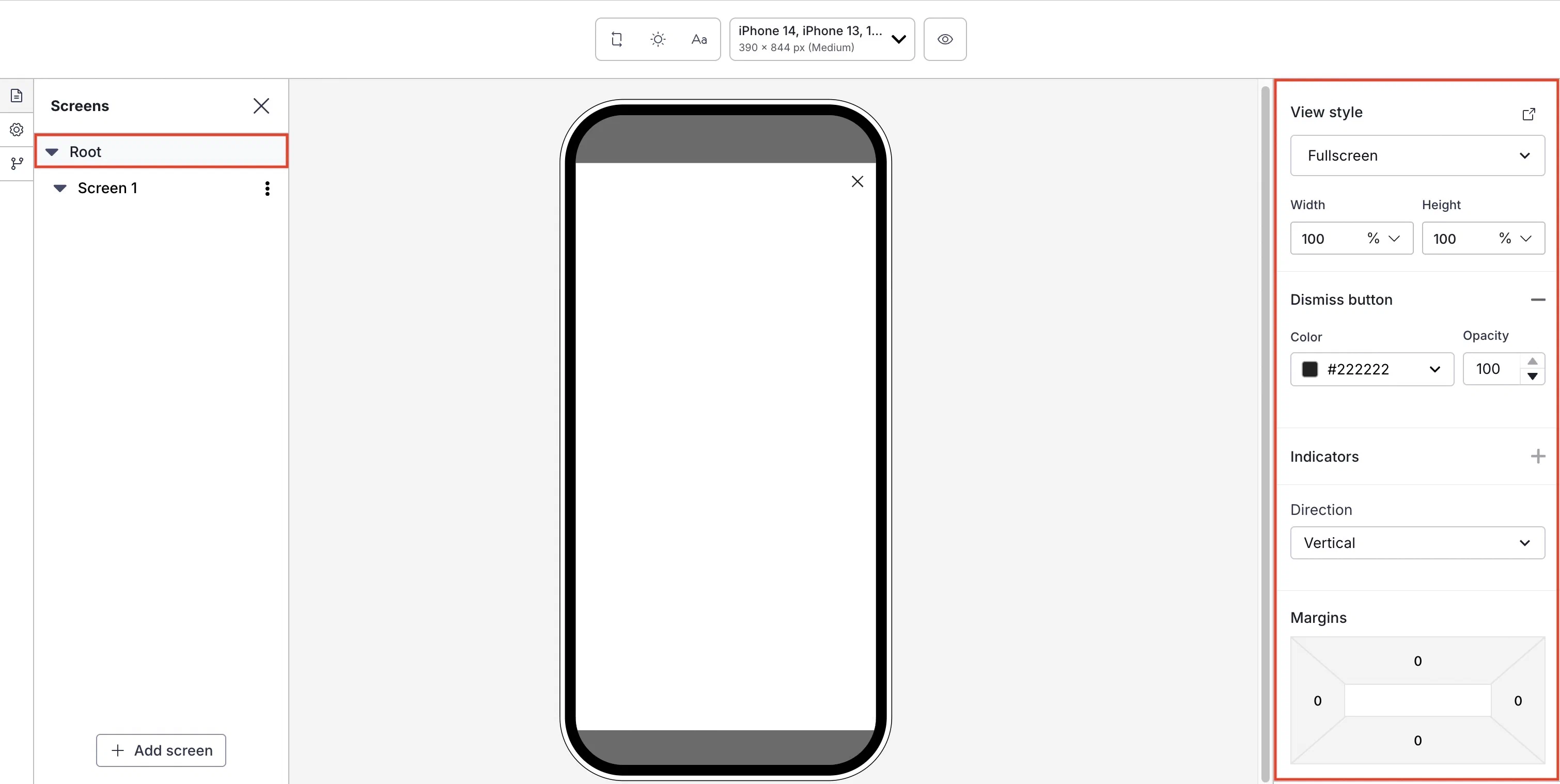Select the file icon in the left sidebar to configure the appearance of your screens. Follow the steps in Set the root appearance, Provide custom HTML, and Configure screens.