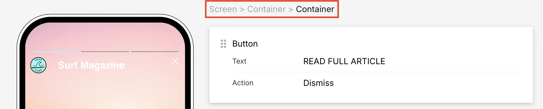 | Light/Dark mode | This tool shows the appearance of elements with an assigned Color SetA named pair of hexadecimal color values supporting device Light and Dark modes. Color sets can be selected for any color field in a scene and when configuring the default appearance of Scenes and In-App Automations. Dark mode is supported for Scenes only.. Light Mode values appear in Dark Mode preview if no Dark Mode value was entered for a color set. | Toggle the selector. |