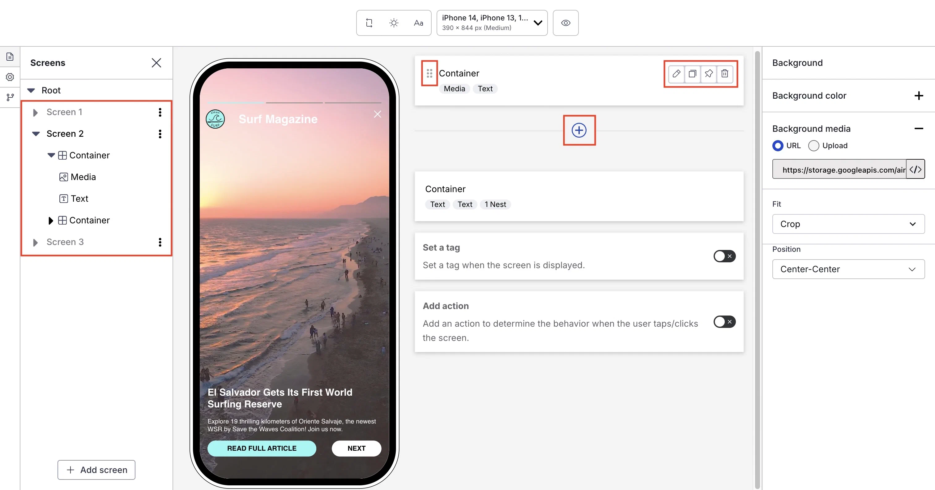 When setting the Size of a content element, the Width and Height options change dynamically based on the Size settings of its parent Container. A Scene’s root view is a vertically scrolling linear Container, which means its immediate children cannot have a percentage height set. For a Container content element, the options change based on its child elements. For example, if the first element you add to a screen is an image using the Media element, you cannot set its height using percentage. However, if you instead add a Container with a fixed height in pixels, you can then nest a Media element within the Container and set the Media to a percentage height.
