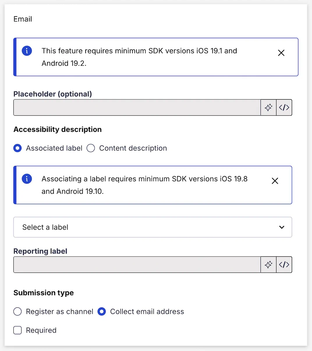 When using a Text element as the label for an input field, set it as the field’s accessibility description. See Accessibility description in Email, SMS, and Text Input.