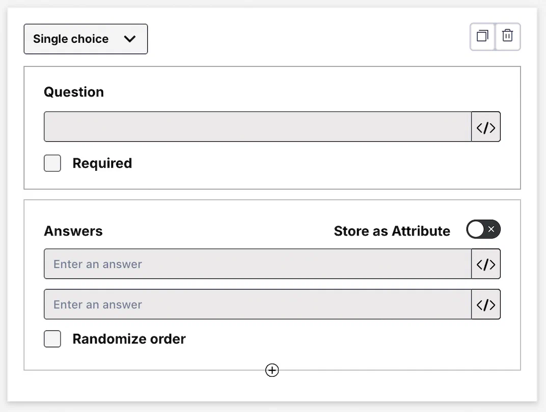 | Store as Attribute | Optional. Enables storing input as text an AttributeMetadata used for audience segmentation and personalization. They extend the concept of Tags by adding comparison operators and values to determine whether or not to target a user, helping you better evaluate your audience.. To use this feature, you must first add the Attribute to your project. | Toggle to enable, then search for and select an Attribute. |