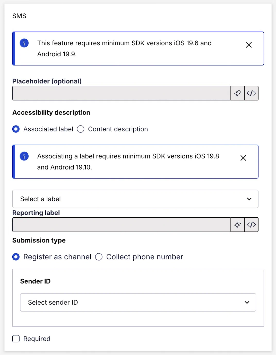 | Submission type | Required. Determines whether the phone number will be only collected as data or also registered as a channel. | Select a type. For channel registration, select at least one Sender IDAn originating phone number or string identifier used to indicate who an SMS message comes from. Members of your audience subscribe (opt in) to each sender ID they want to receive messages from. to associate with the channels, one ID per country. For collection, select which countries can submit phone numbers. |