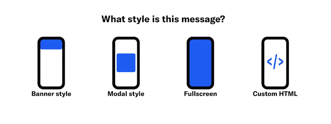 Select a message style: banner, modal, fullscreen, or Custom HTML.