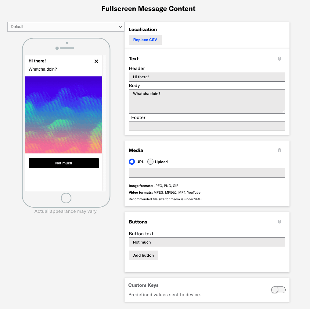 header— Sets value for Header text.body— (Required) — Sets value for Body text.media— Sets URL for Media field. HTTPS required. URL must be accessible by your mobile audience.- Image formats: JPEG, JPG, PNG, GIF