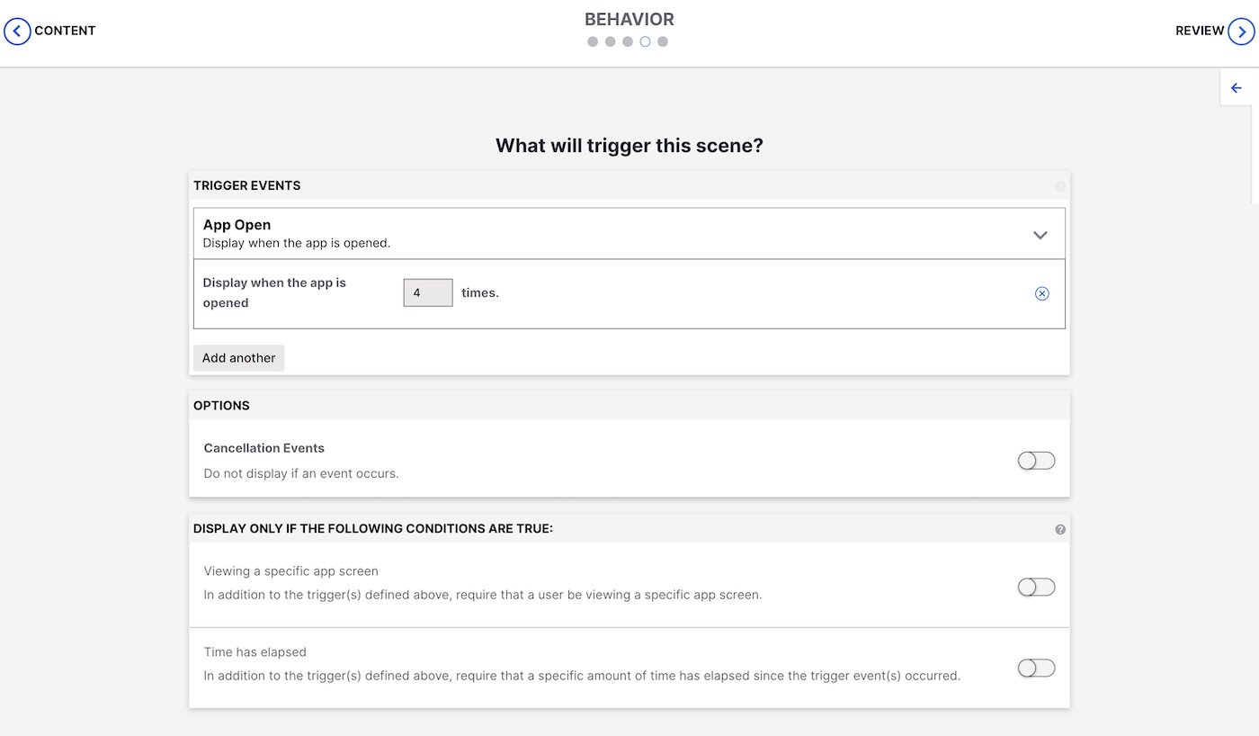 Configure the event that will cause the Scene to appear to users. You can also configure cancellation events and conditions for displaying the Scene.