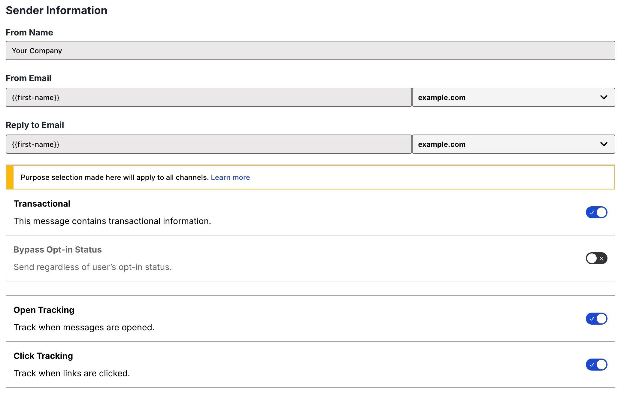Enable to send the message to users who opted out of transactional messages. Open and Click Tracking Records an event when the email is opened and/or links are clicked. Only HTTP and HTTPS links are tracked. Enabled by default. When enabled, opens and clicks are tracked for all channels that have not been opted out. When disabled, opens and clicks are not tracked for any channels. See Contact Management to manage open and click tracking at the channel level.