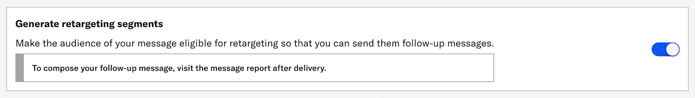 To make this audience eligible for retargeting, enable Generate retargeting segments. This option is only available when your only selected channels are app platforms, Web, and Email.