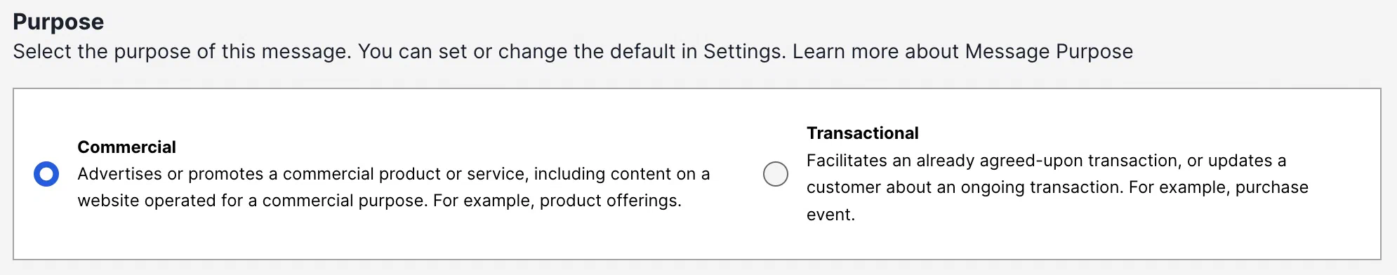 When enabled, Message Purpose requires designating each message (sent to any channel) as commercial or transactional. You must select a default value of Commercial, Transactional, or Unset.