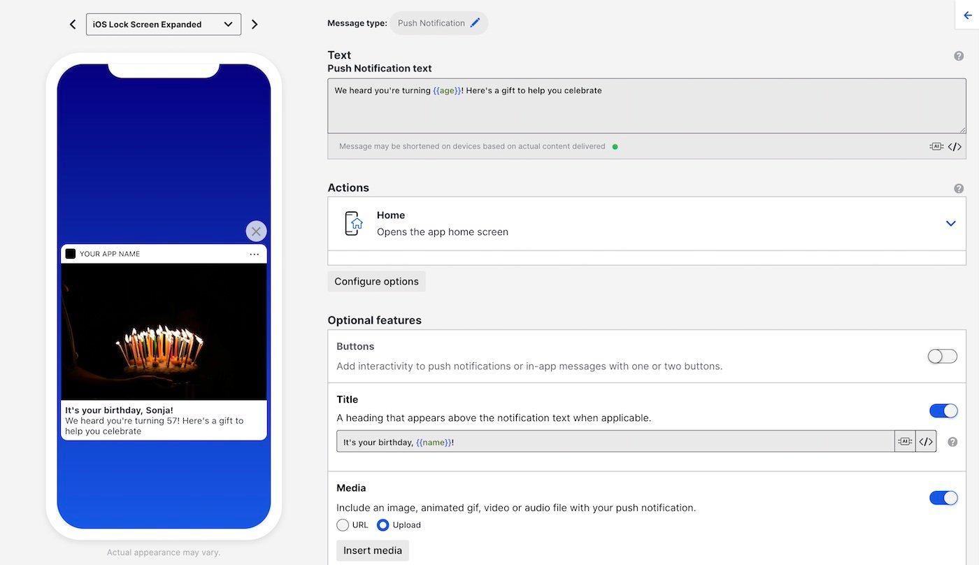 For example, if you were sending a birthday message to your audience, you could target the audience using an AttributeMetadata used for audience segmentation and personalization. They extend the concept of Tags by adding comparison operators and values to determine whether or not to target a user, helping you better evaluate your audience. for a specific date and also use relevant Attributes within the body of the message to personalize based on an individual’s specific age, location, etc. Use HandlebarsHandlebars is Airship’s templating language for personalization. Handlebars expressions use double curly braces wrapped around a content template, ranging from a simple variable, e.g., {{first_name}}, to complex evaluations of personalization data. to reference Attributes in message content.