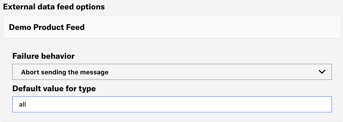 Failure behavior — Determine how your message is handled if the feed fails. If your message still makes sense without a feed, you may want to send the message even if your data feed fails. Also consider how ongoing (automated and recurring) messages will be affected if you later delete the feed.