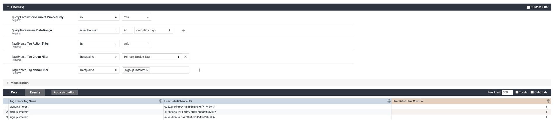 Follow these steps to get a list of users that had a Tag added after interacting with a button in an In-App AutomationMessages cached on users’ devices and displayed when users meet certain conditions within your app, such as viewing a particular screen or opening the app a certain number of times.. We only need to use the default filters. You must know the name of the Tag for the button interaction. Users will be identified by Channel IDAn Airship-specific unique identifier used to address a channel instance, e.g., a smartphone, web browser, email address..