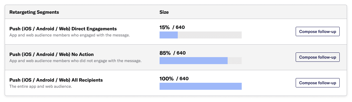 Audience retargeting is a method for sending follow-up messages to the audience of a parent message. This method is available for push notifications (app and web) and email in the Message composer.When a message generates retargeting SegmentsA grouping of audience members selected by unique or shared identifiers. Multiple identifiers can be combined within a Segment., they are listed under Retargeting Segments in the Performance section of the report. The audience size (recipient count and percentage of total audience) is shown for each Segment.