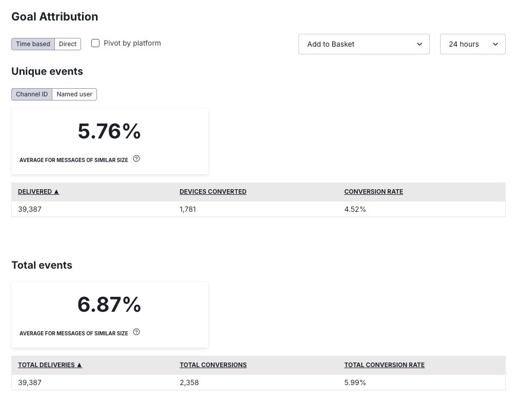 - Average for messages — This is the average conversion rate for similar messages. The average is calculated using messages with a send count ranging from 60% fewer to 60% more than the message’s send count. Compare your message’s conversion rate to this average to see how it performed relative to similar messages.