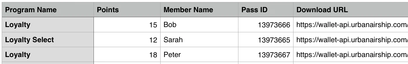 barcode_value: Provide custom barcode values for each pass.externalId: The external identifier value specifies a user ID in a backend system (e.g. a CRM database) that you can use to map a pass to your data. For example, if a customer receives a pass with anexternalIdvalue that links to an ID in your backend loyalty system. When your customer makes a purchase that earns loyalty points, you can update his or her pass can with this new data. This field must be unique. Airship will not process rows containing duplicateexternalIdvalues.