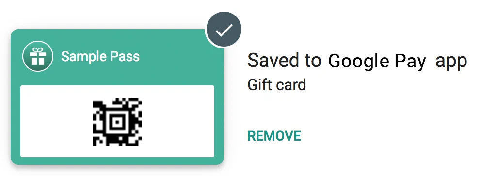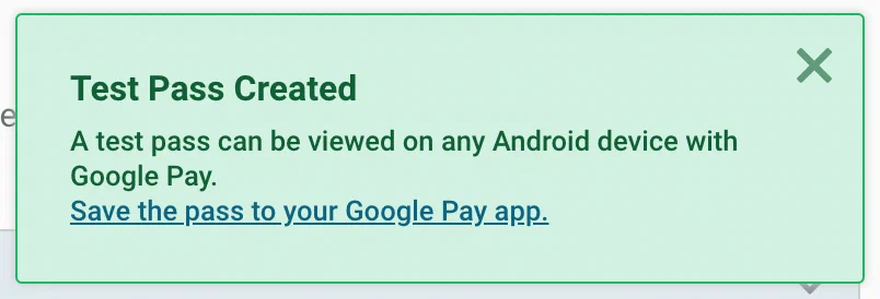 Click Save to save the pass to your Google Wallet app.Confirming the test pass in Google WalletTest pass saved to Google Wallet