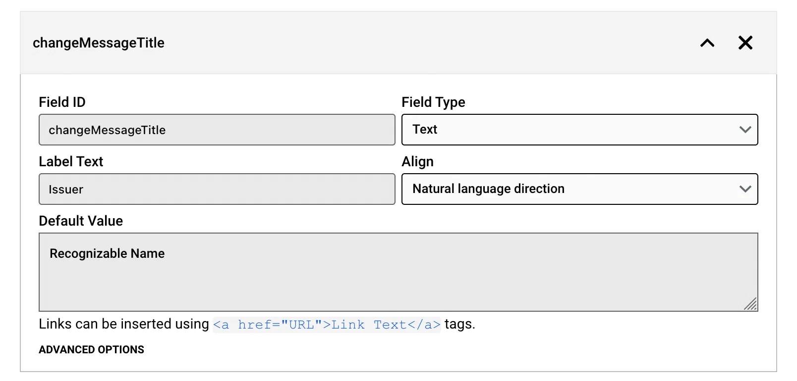 changeMessageTitlefor the field ID, and click Add custom changeMessageTitle field. - Set the Field Type to Text.