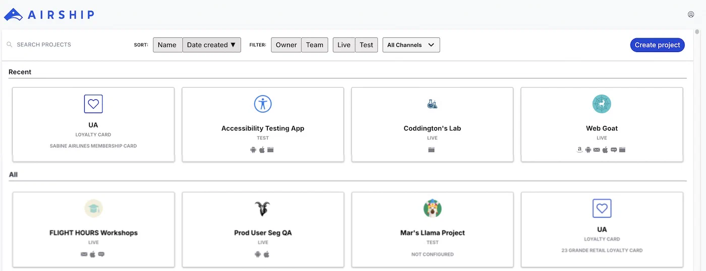 Almost everything you do with Airship happens inside a project, including creating messages and wallet pass templates.