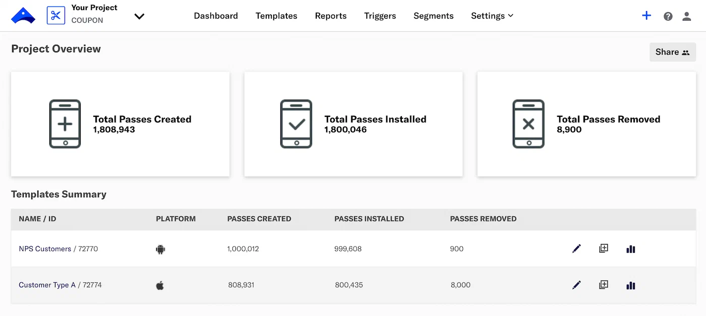 | Passes Removed | The pass has been removed by the end user and not deleted. Deleted passes are removed from the mobile wallet platform but remain on the end user’s device. Only end users can remove the pass. If a pass has been deleted, you will not have the ability to send any updates to the pass. |