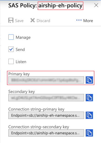 RootManageSharedAccessPolicy. If you add a new policy, it must have at least thesend(write) permission.Copy the policy name and primary key. These are the Shared Access Signature (SAS) Policy Name and Shared Access Signature (SAS) Primary Key Name that you will provide to Airship to authenticate with your Azure Event Hub.