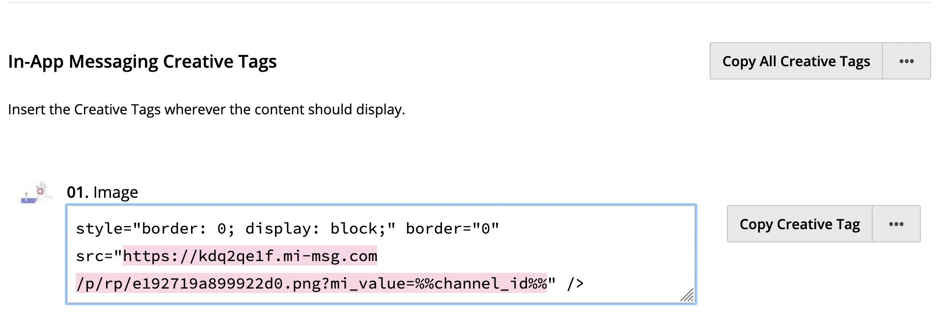 - Click In-App Messaging and copy the Creative Tags that you want to add to your automation.