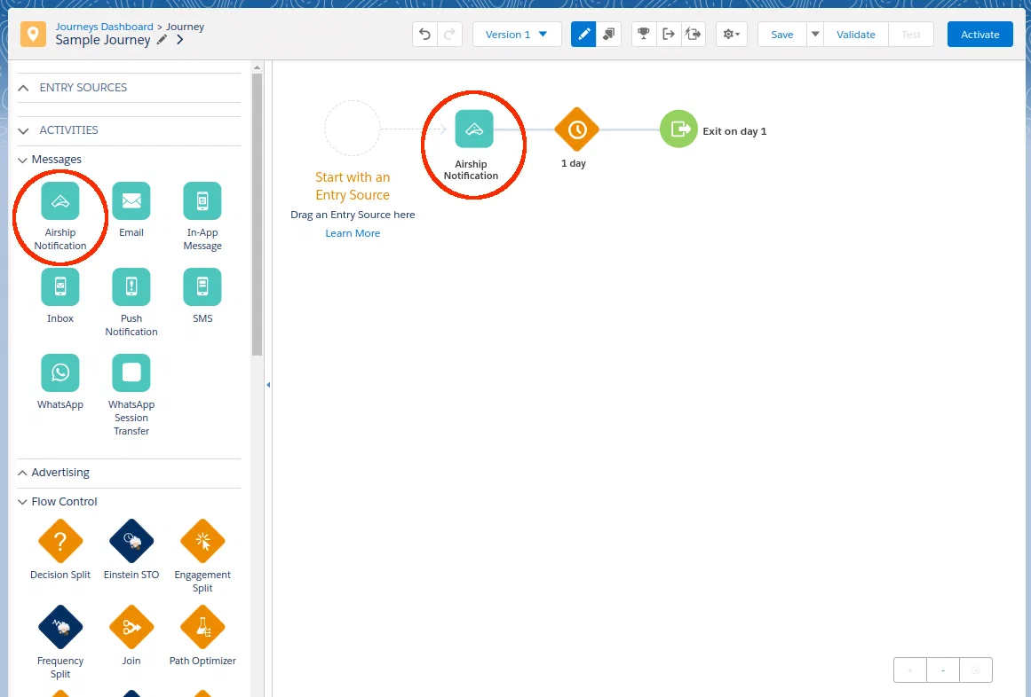 - In the left sidebar, go to Activities, then Messages, then drag the Airship Notification activity into your journey.
