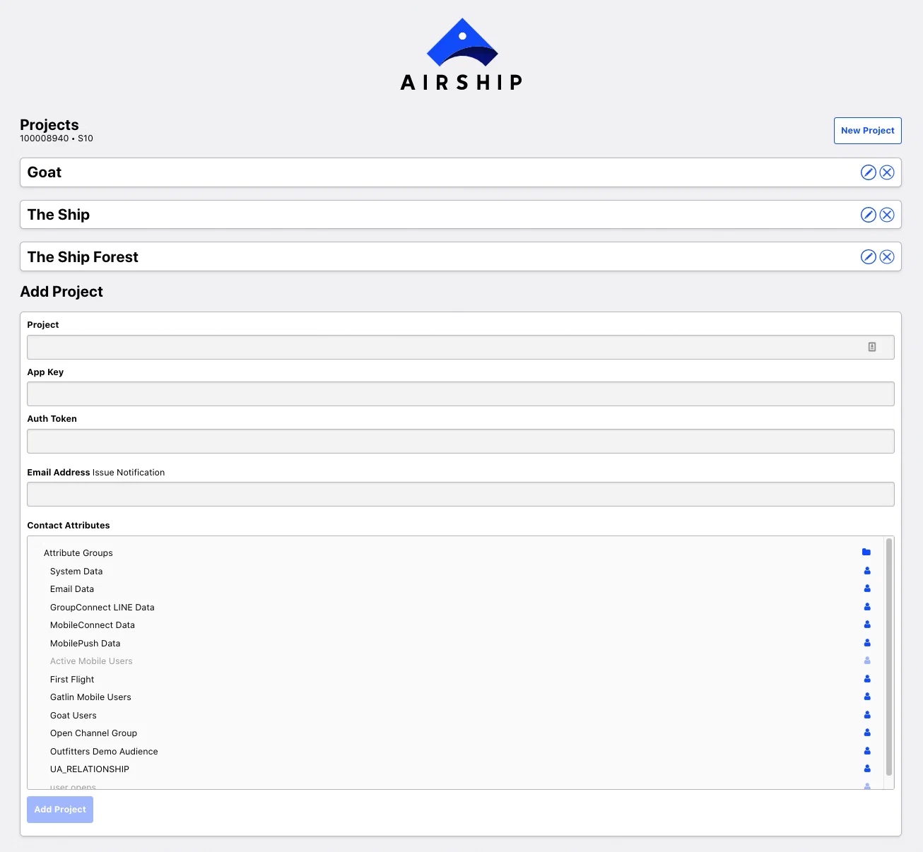 - Select New Project or select the edit icon () to edit the settings for an existing Airship project.
