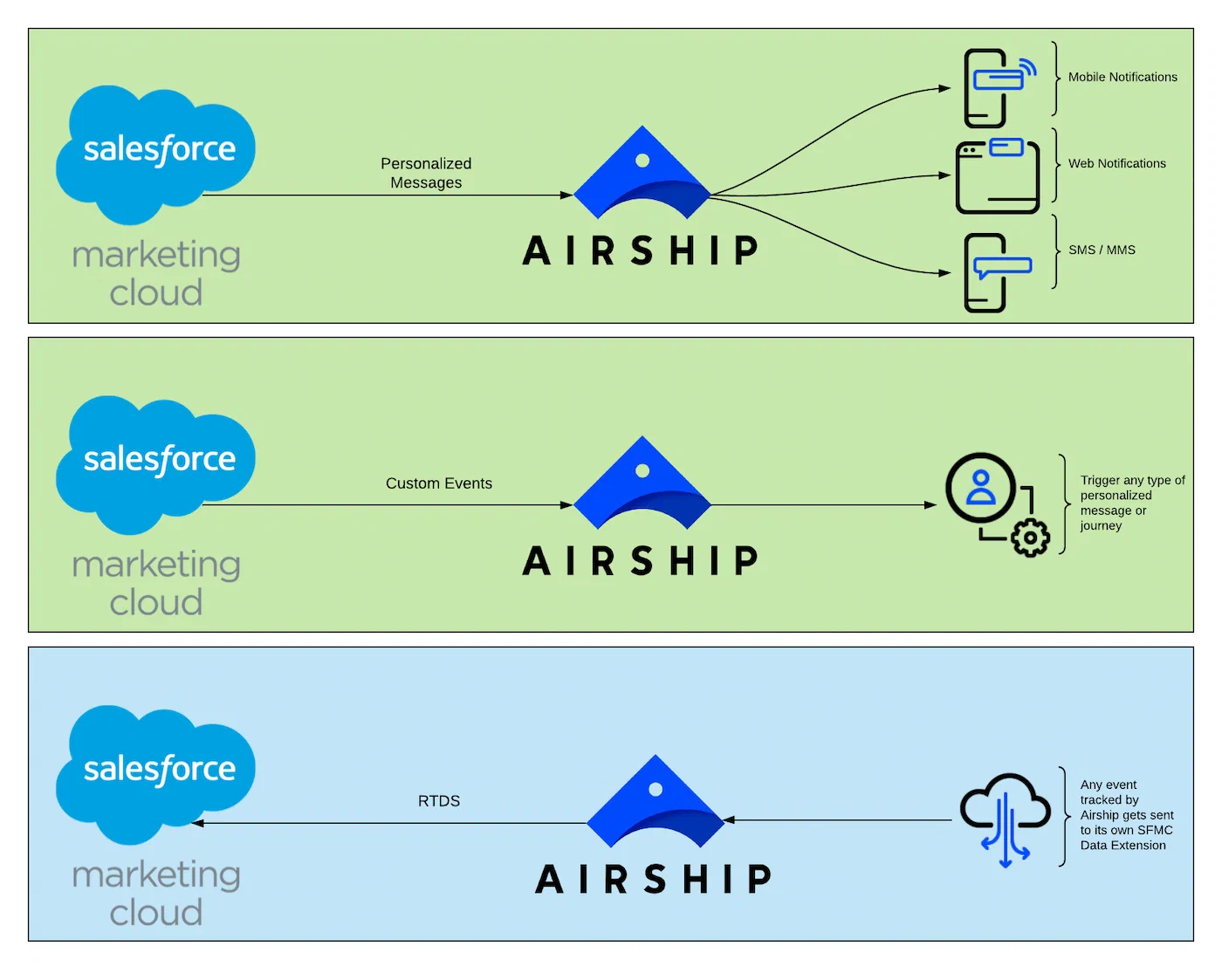 Send events from Airship to SFMC using Real-Time Data StreamingA service that delivers user-level events in real time to your backend or third-party systems using the Data Streaming API. to incorporate your audience’s message activities into your CRM environment.